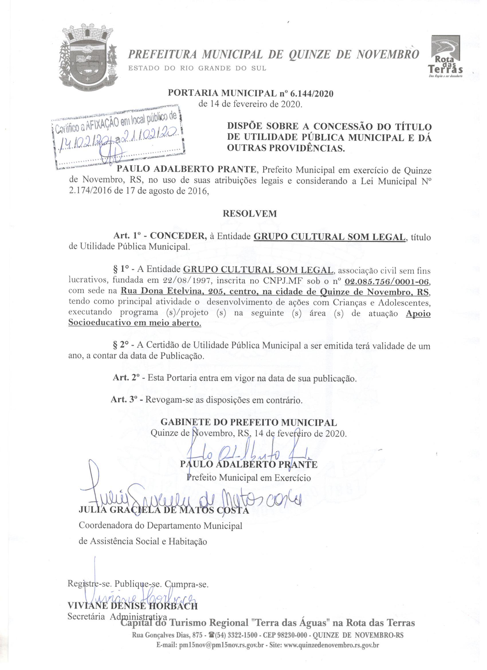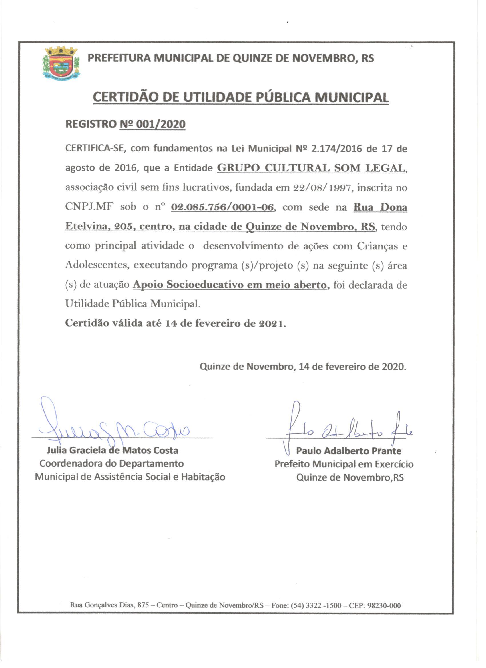 Título de Utilidade Pública Municipal (Certidão + Portaria)
